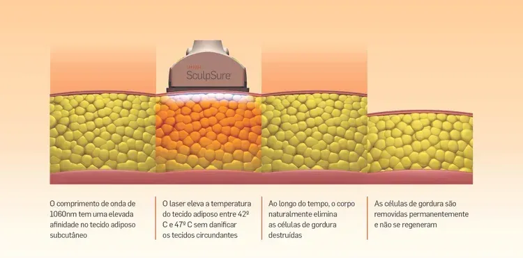 Com um comprimento de onda de 1060nm, o laser SMART LipoLaser eleva a temperatura do tecido adiposo entre os 42º e os 47º sem danificar os tecidos circundantes, destruindo eficientemente a gordura subcutânea localizada, em apenas 25 minutos. Com o passar dos dias, o corpo elimina os adipócitos destruídos de forma natural e permanente.